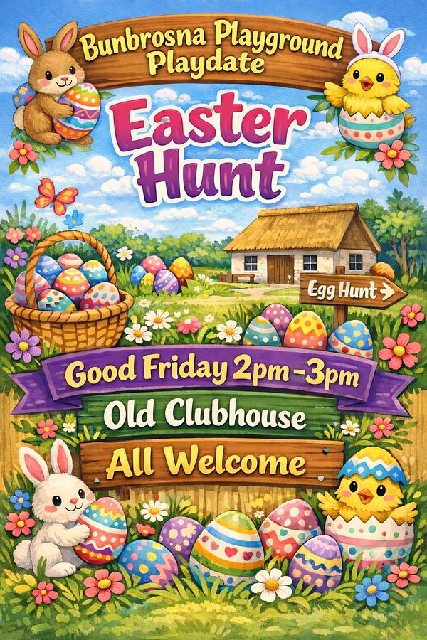 The Playground Playdates are having an Easter Hunt on Good Friday between 2-3pm. Everyone is welcome to come along for some sweet treats.